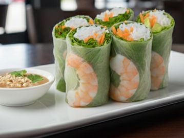Poached shrimp or tofu and salad wrapped in rice paper.