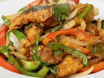 Sautéed battered fish fillet with basil, eggplant, bell pepper in Kaffir lime chili sauce.