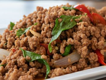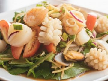 Calamari, prawn, scallop and mussel sautéed with eggplant, onion, bell pepper, cabbage, Thai spices and basil in garlic chili sauce.