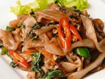 Spicy pan fried flat rice noodles with bell pepper, green bean, onion, tomato, basil in garlic chili sauce.