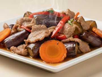 Stir fried spicy sliced beef with bell pepper, onion and squash.