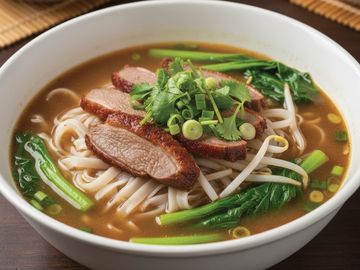 Sliced roasted duck in homemade duck broth.