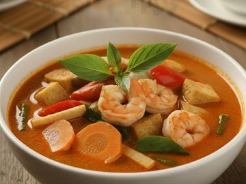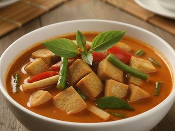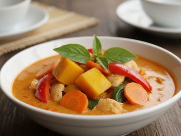 Red curry with pumpkin, bell pepper, carrot and basil.