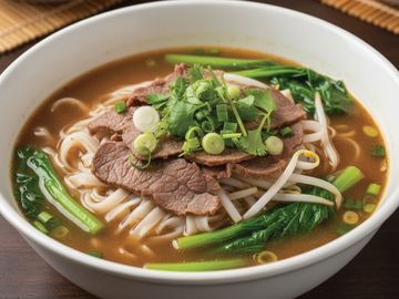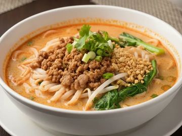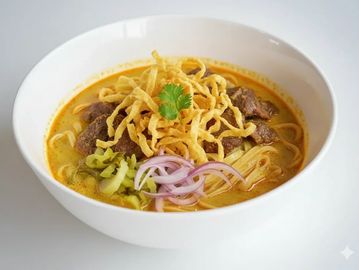 Egg noodle topped with special yellow curry with onion, carrot, pickles and crispy noodle.