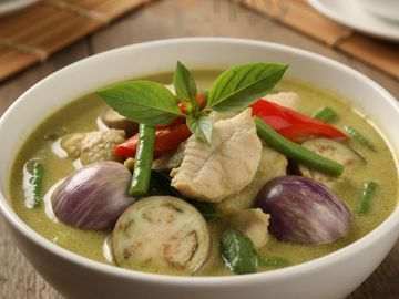 Spicy green curry with green bean, bell pepper, eggplant and basil.