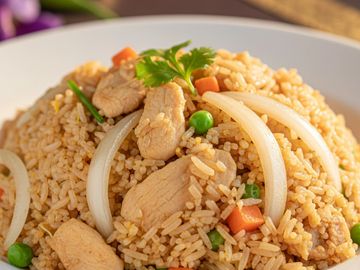 Fried rice with egg, tomato, pea & carrot and onion.