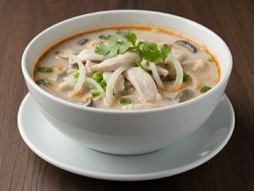 Coconut milk soup with lemongrass, galangal, kaffir lime leaves, onion and mushroom.