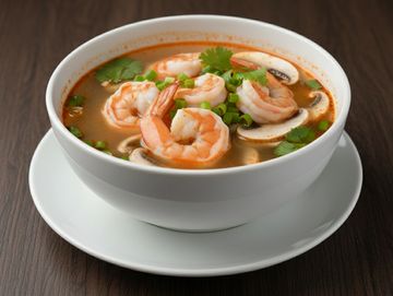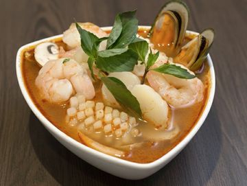 Hot & sour combination seafood soup with lemongrass, galangal, kaffir lime leaves, basil, onion and mushroom.
