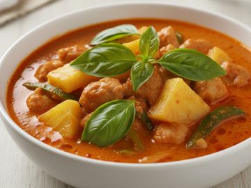Red curry with pineapple, tomato, bell pepper and basil.
