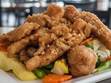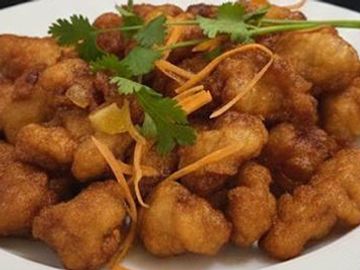 Battered fish fillet topped with sautéed pineapple, bell pepper, onion In sweet and sour chili sauce.