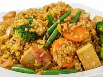 Fried rice with basil, egg, tomato, onion, bell pepper in spicy garlic chili sauce.