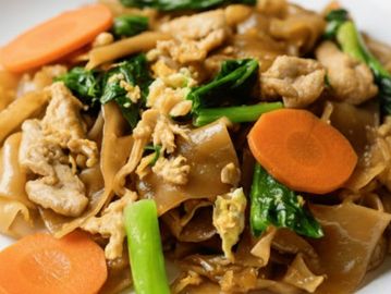 Pan fried flat rice noodle with egg, Chinese broccoli and carrot.