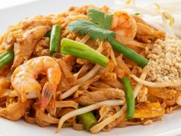 Pan fried thin rice noodle with egg, tofu, bean sprout, green onion and ground peanut.