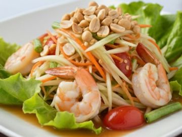 Shredded green papaya with tomato, chilies, green beans, peanuts tossed with lime based salad dressing. ( Add shrimps +$3)