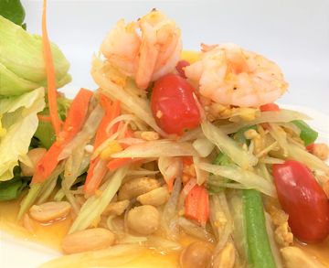 Shredded green papaya with tomato, chilies, green beans, peanuts tossed with lime based salad dressing ( Add shrimps +$3)