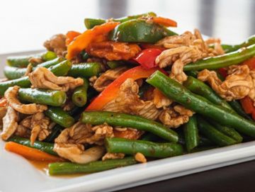 Sautéed spicy garlic sauce with green bean, bell pepper, onion and basil. (Add fried egg +$3)
