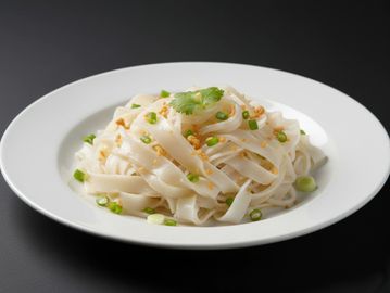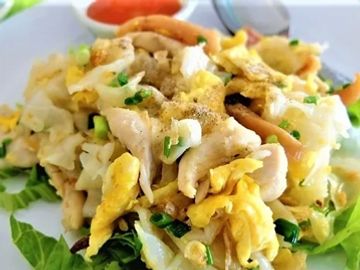 Pan fried flat rice noodle with egg, bean sprout, green onion in light garlic sauce, served on a bed of lettuce and hot sauce.